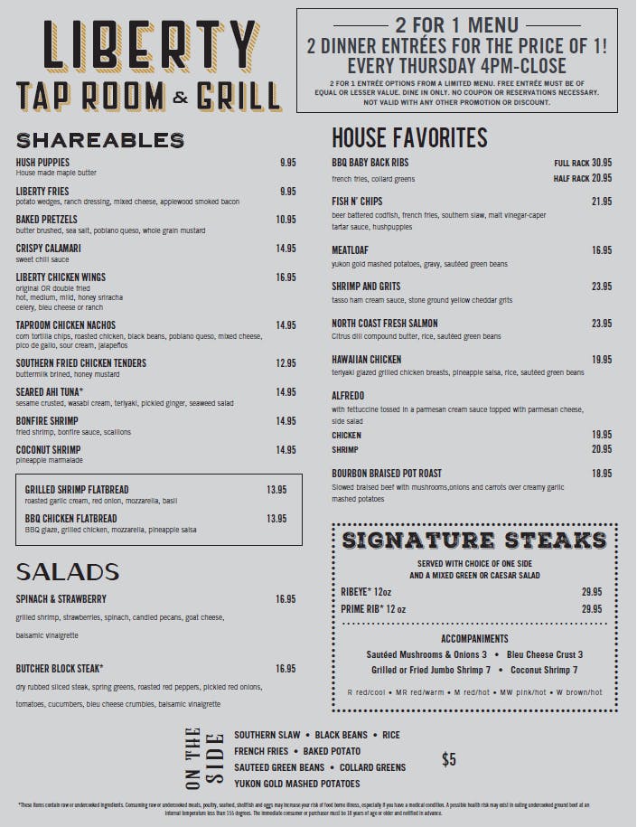 2 FOR 1 ENTRÉE OPTIONS FROM A LIMITED MENU. FREE ENTRÉE MUST BE OF EQUAL