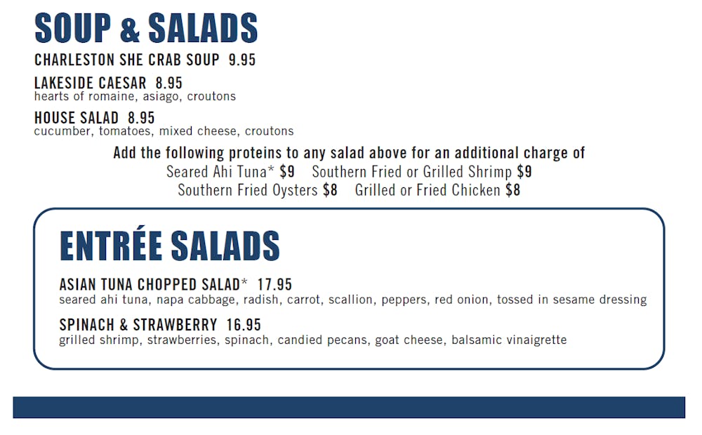Add the following proteins to any salad below for an additional charge of Seared Ahi Tuna* $9 Southern Fried or Grilled Shrimp $9 Southern Fried Oysters $8 Grilled or Fried Chicken $8-